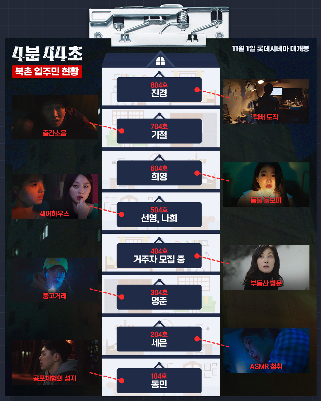영화 <4분 44초>는 북촌 아파트 단지 내에서 일어난 실종 사건에 대한 이야기로, 실종 사건과 층간 소음을 주로 다루는 이야기라고 합니다.