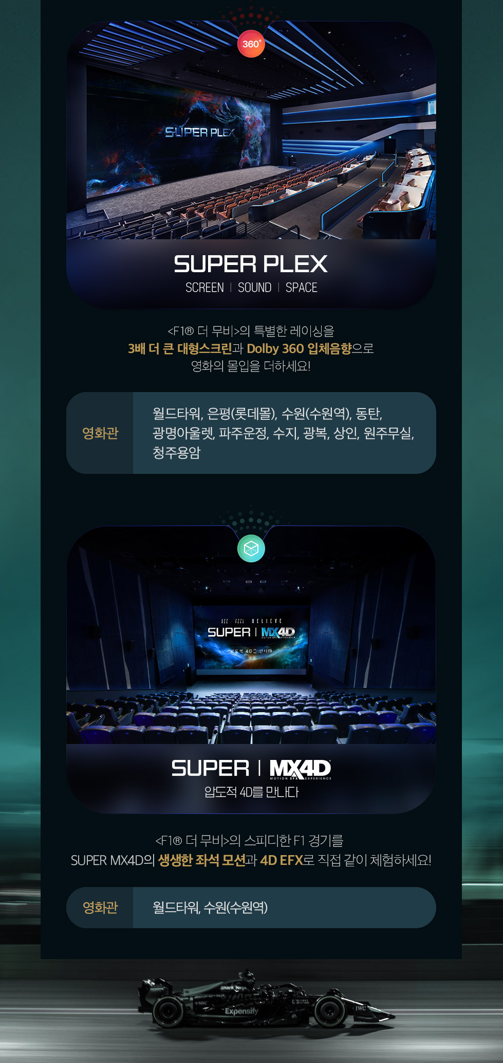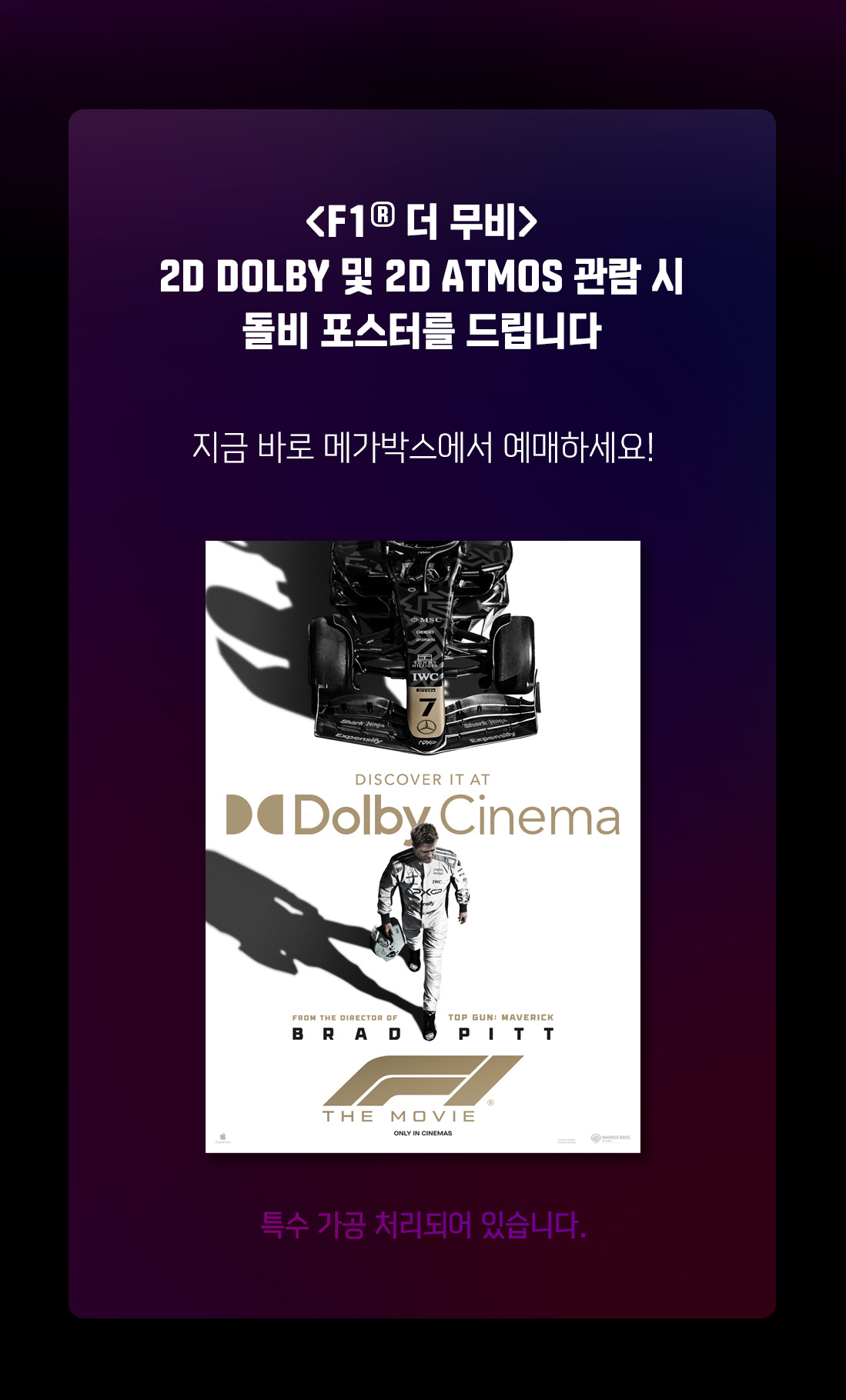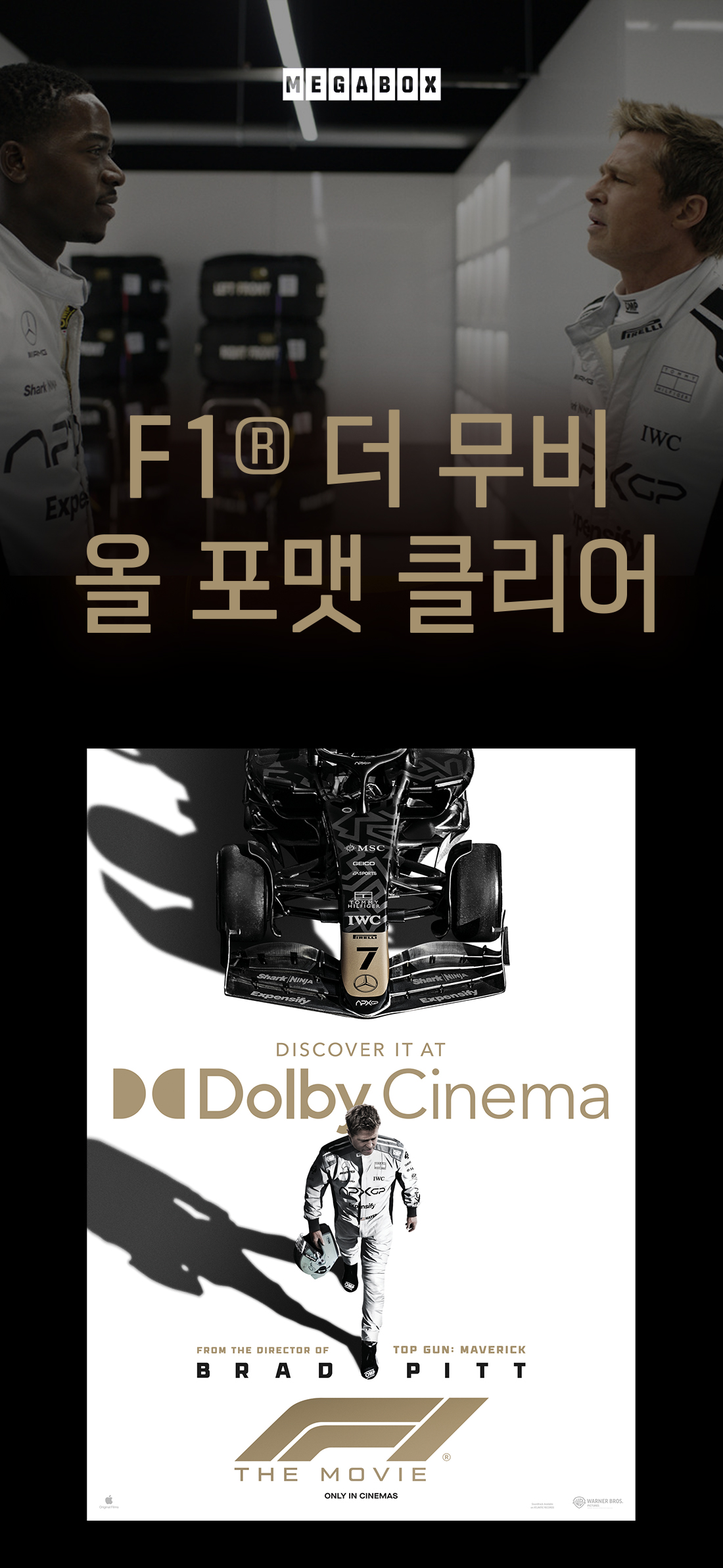 메가박스에서 올 포맷 클리어 이벤트가 진행됩니다. 기간은 2025년 6월 25일 수요일부터 2025년 7월 13일 일요일까지이며, 응모를 하고 영화 <F1: 더 무비>를 돌비 & MX4D로 모두 관람시 전원 승급 2,000P를 증정한다고 합니다.