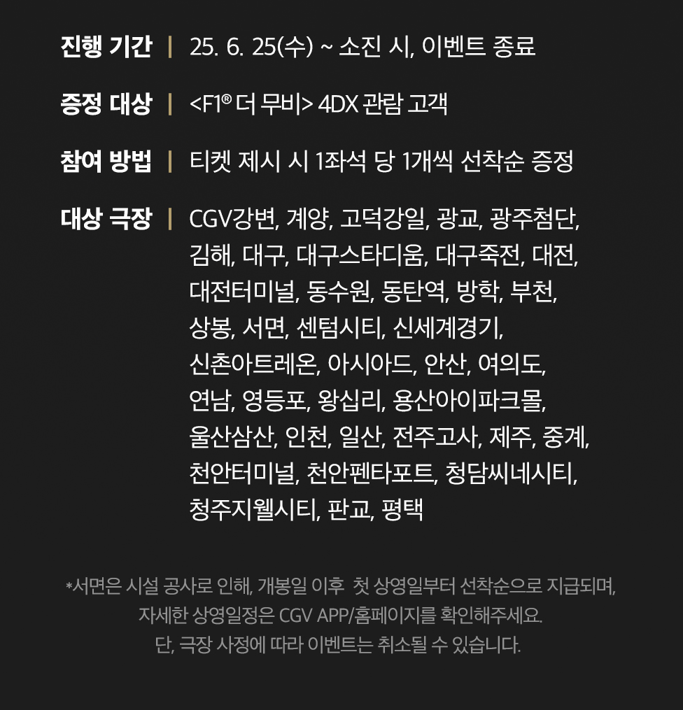 CGV 4DX 1주 차 특전은 4DX 리미티드 포스터(A3 사이즈)입니다. 2025년 6월 25일 수요일부터 소진될 때까지 증정합니다.