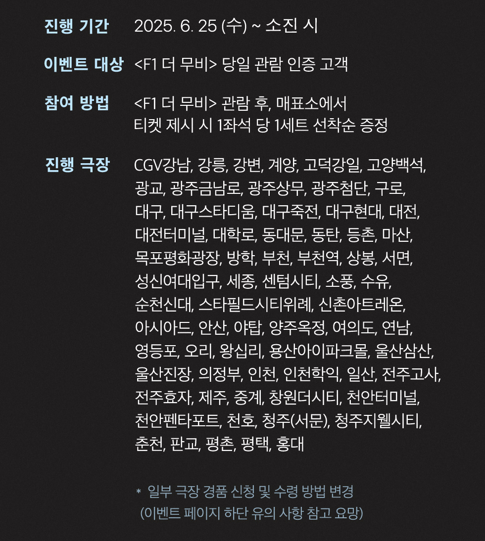 포뮬러 1을 소재로 하는 조셉 코신스키 감독, 배우 브래드 피트 주연의 영화 <F1: 더 무비>가 내일 개봉합니다. 그러면서 극장가는 관객 유치를 위해 여러 특전을 진행하는데, 얼마 전에 개봉한 영화 <28주 후>보다 목록이 훨씬 좋다고 느껴져서 이번에도 관심 있으신 분들은 확인하시고 영화도 보고 각종 특전을 챙기시길 바랍니다.