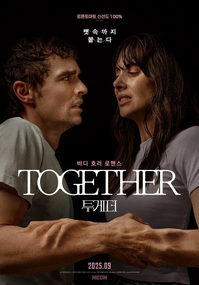 그동안 많은 미스터리 호러 영화가 있었지만, 몸의 뼈와 세포까지 붙는 내용은 처음 봐서 그런지 섬뜩하고 궁금합니다. 영화 <투게더>는 2025년 9월 3일 수요일에 영화관(극장)에서 개봉합니다.