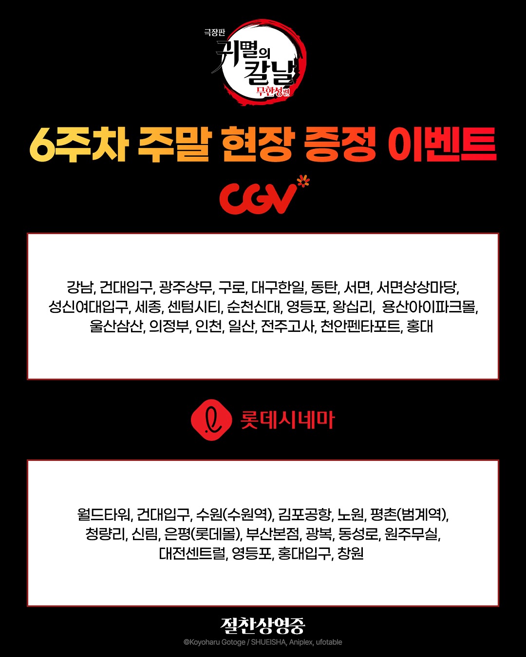 CGV, 롯데시네마, 메가박스, 씨네큐 6주 차 현장 증정 이벤트 지점 목록