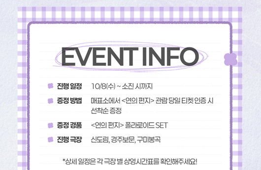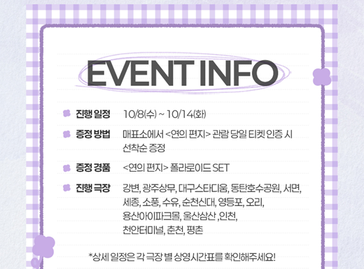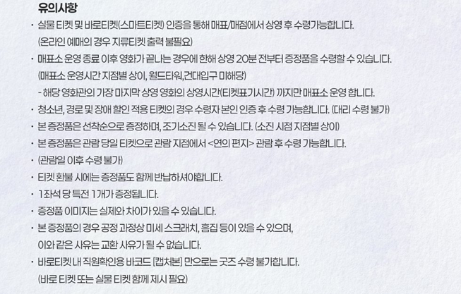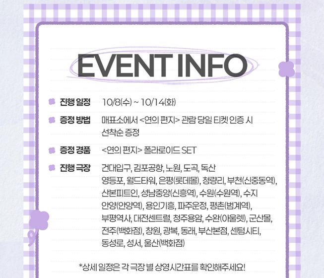 ※ 각 영화관(극장) 특전 및 이벤트 목록들은 이미지를 클릭하시면 잘린 곳 없이 전체가 모두 보이며, 더욱 자세하게 파악이 가능합니다. 유의사항이 있으니 꼭 확인하셔서 차질 없으시길 바랍니다.