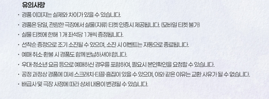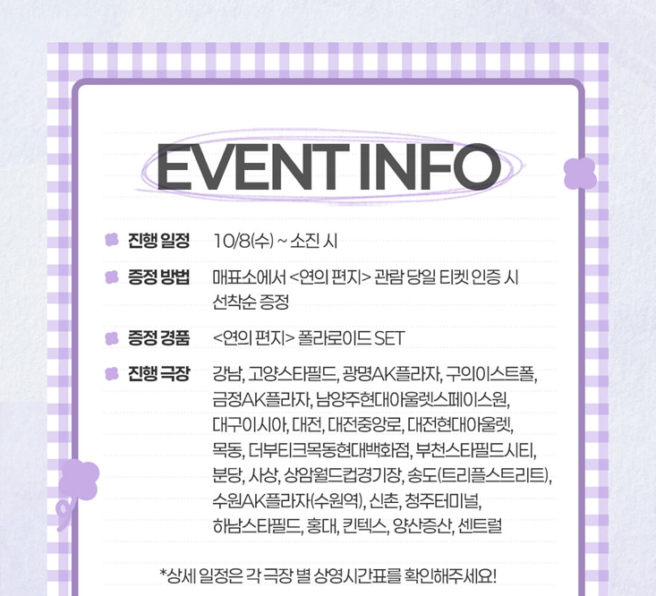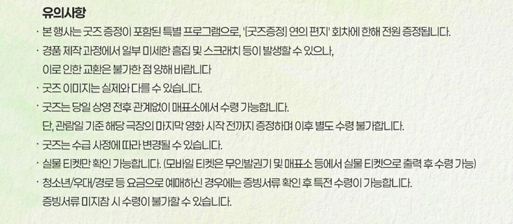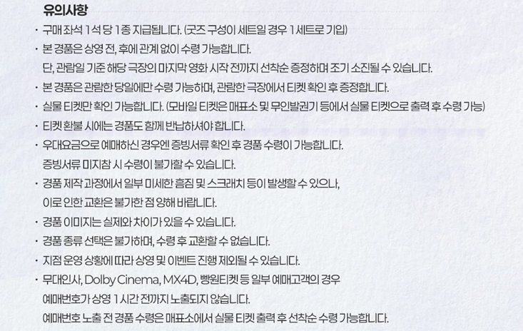 진행하는 CGV 상영점이 상당히 적습니다. 그중 영등포, 용산아이파크몰, 울산삼산, 천안터미널 지점은 온라인 선착순 신청 성공 고객 대상으로만 특전 경품 굿즈를 지급하니 참고하시길 바랍니다.