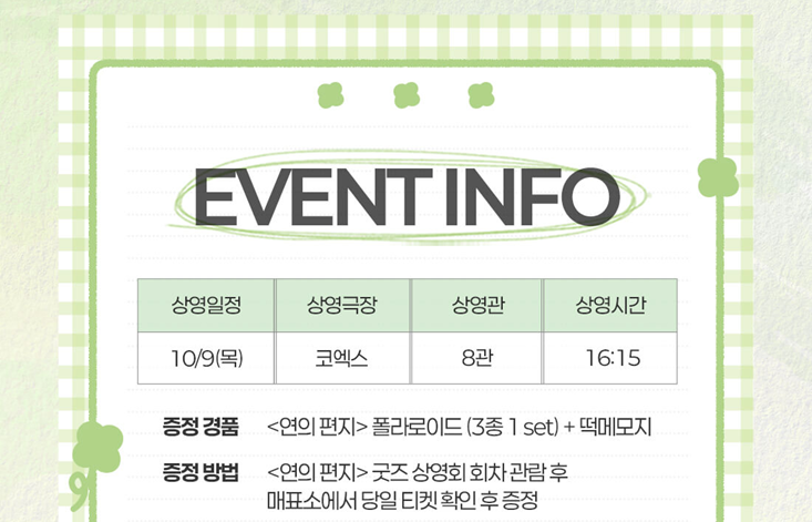 메가박스에서 '찾았다! 굿즈 상영회'를 진행합니다. '애니메이션 영화 <연의 편지> 폴라로이드 3종 1 SET와 떡메모지'를 증정합니다. 2025년 10월 9일 목요일 메가박스 코엑스 지점 8관 오후 4시 15분, 딱 단 1차례 지급합니다.