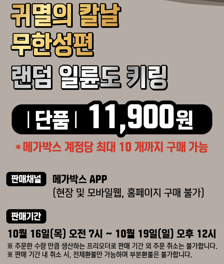 이번에도 메가박스에서 랜덤 일륜도 키링을 추가로 판매합니다. 3차부터 이번 4차 역시 1인 최대 10개까지 구매를 할 수 있다고 하며, 이번에도 역시 특정 키링을 선택할 수 있는 것이 아닌 무작위를 뜻하는 랜덤이라고 합니다. 2025년 10월 16일 목요일 오전 7시부터 10월 19일 일요일 오후 12시까지 판매한다고 합니다. 수령 기간은 2025년 10월 31일에 공개한다고 합니다.