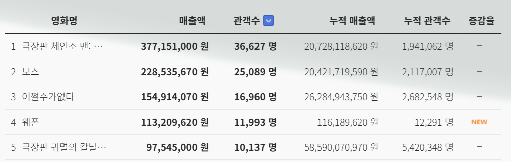 애니메이션 극장판 <귀멸의 칼날: 무한성편>이 최근 540만 명의 누적 관객수를 넘어서면서, 역대 일본 애니메이션 영화 한국 흥행 순위 1위인 <스즈메의 문단속>을 넘기 직전입니다. 벌써 9주 차로 접어들었는데, 상영관이 줄기도 했고, 이미 대부분의 팬들이 관람을 끝냈기 때문에 평일 관객이 하루 5,000 ~ 10,000명대 정도가 유지되고 있습니다.
