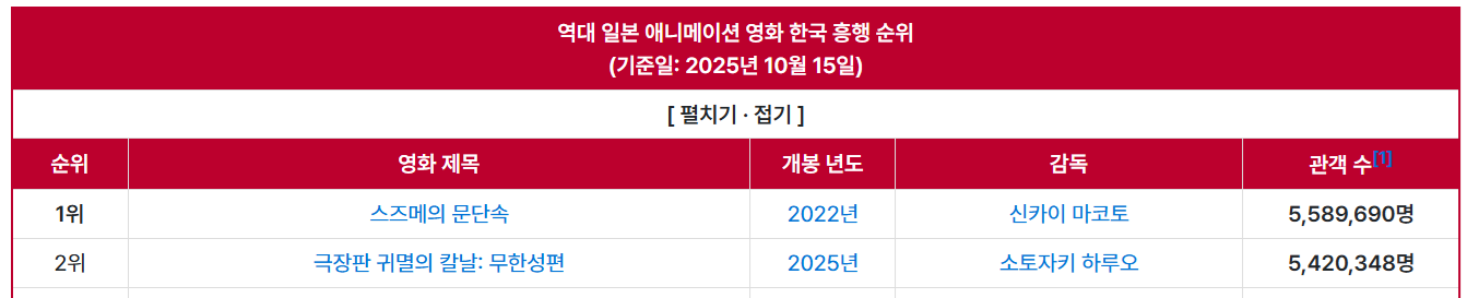 | [25년 만에 미국 흥행 기록 경신! 애니메이션 극장판 <귀멸의 칼날: 무한성편> 9주 차 특전 목록] (0) | 2025.10.15 |
