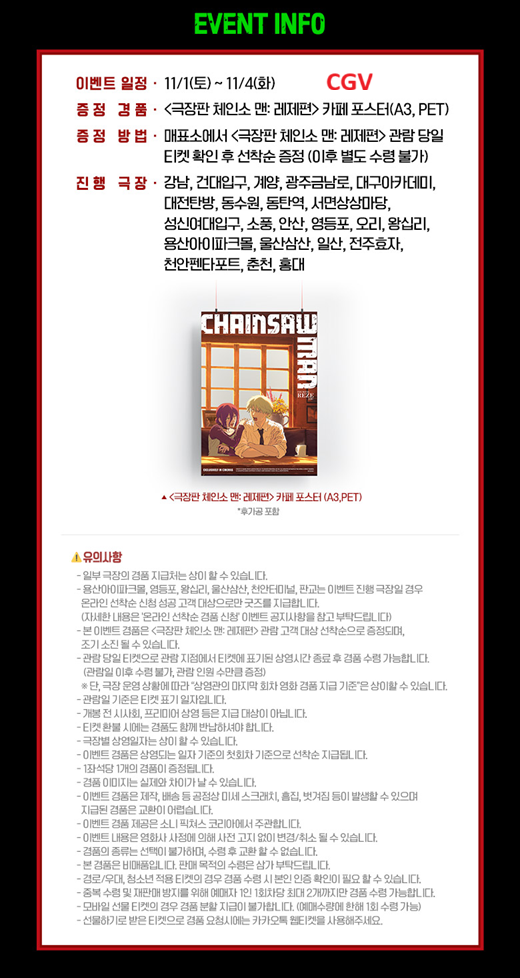 CGV의 상영관 중 영등포, 왕십리, 용산아이파크몰, 울산삼산 지점은 기존 특전 경품 굿즈 수령 방식과 다른 방식인 온라인 선착순 신청 성공 고객에게만 특전 경품 굿즈를 지급한다고 하니 미리 신청하셔서 불찰 없으시길 바랍니다.