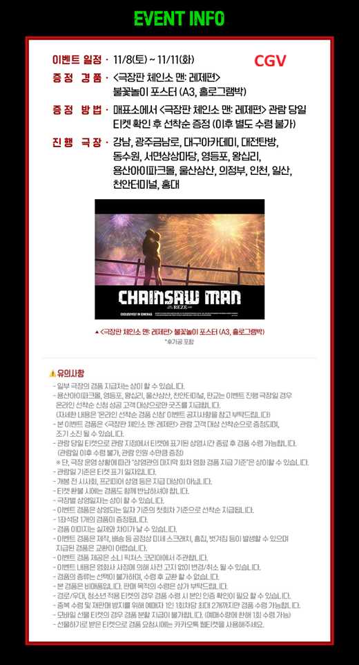 CGV는 2025년 11월 8일 토요일부터 2025년 11월 11일 화요일까지 증정하며 소진되면 종료합니다. 그리고 CGV 상영관 중 영등포, 왕십리, 용산아이파크몰, 울산삼산, 천안터미널 지점은 특전 경품 굿즈 수령 방식이 기존 방식과 다른 방식인 '온라인 선착순 신청 성공 고객'에게만 특전 경품 굿즈를 지급한다고 하니 미리 신청하셔서 불찰 없으시길 바랍니다.