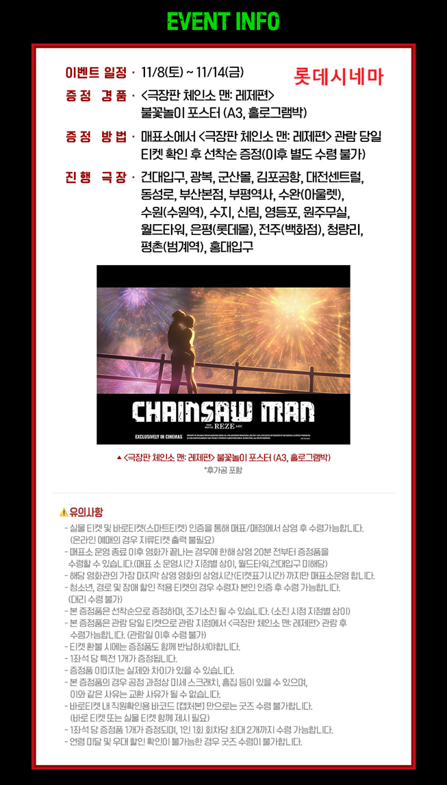이번 애니메이션 극장판 <체인소 맨: 레제편>의 7주 차 주말 특전 목록이 경쟁률이 치열할 것 같습니다. 바로 덴지와 레제의 키스신이 담긴 불꽃놀이 포스터인데, 개봉 초기와 가끔 엇나가서 랜덤 증정이나 팬들의 니즈를 파악하지 못하는 모습만 보이다가, 요즘엔 계속해서 정신을 제대로 차린 모습을 보여주고 있습니다.