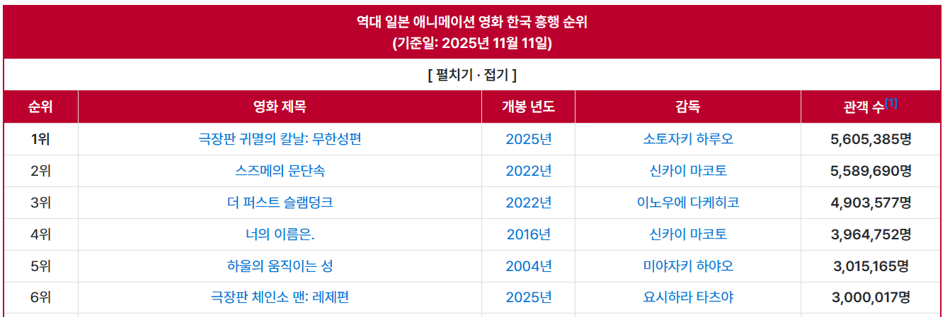 | [애니메이션 극장판 <귀멸의 칼날: 무한성편> 역대 일본 애니메이션 영화 흥행 순위 1위 달성] (0) | 2025.11.09 |