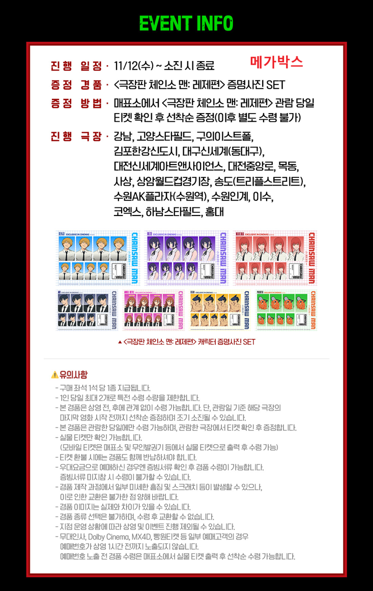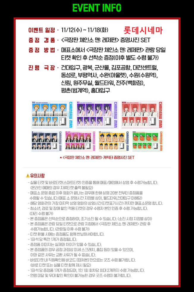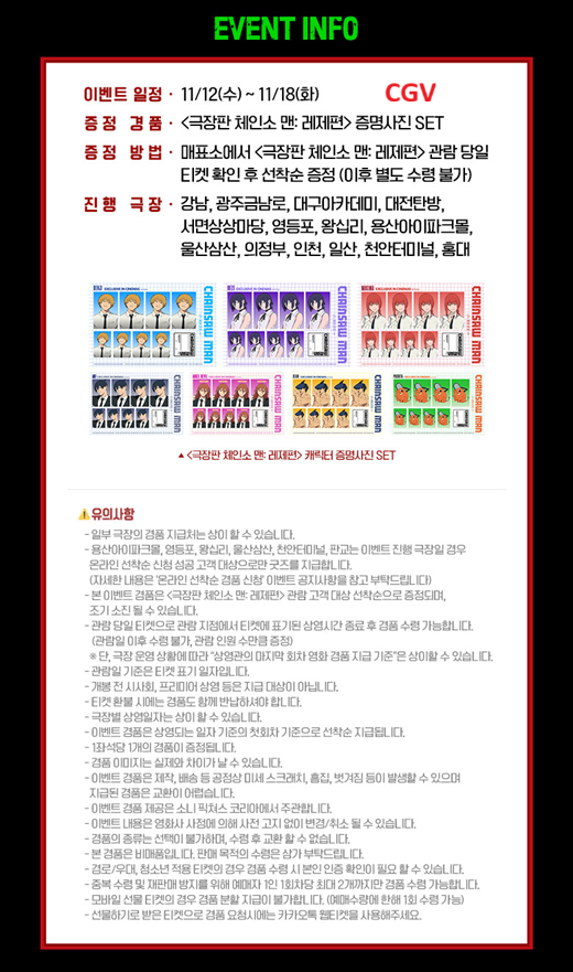 오늘도 역시 벌써 개봉 2달째에 접어든 애니메이션 극장판 <체인소 맨: 레제편>의 특전 경품 굿즈 목록입니다. 영화 관람과 함께 특전 경품 굿즈를 수령하시면 더 좋은 추억으로 남지 않을까 싶습니다.