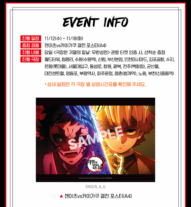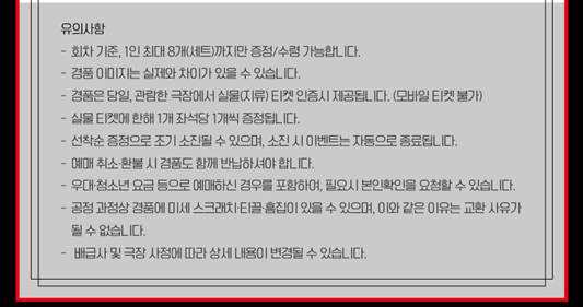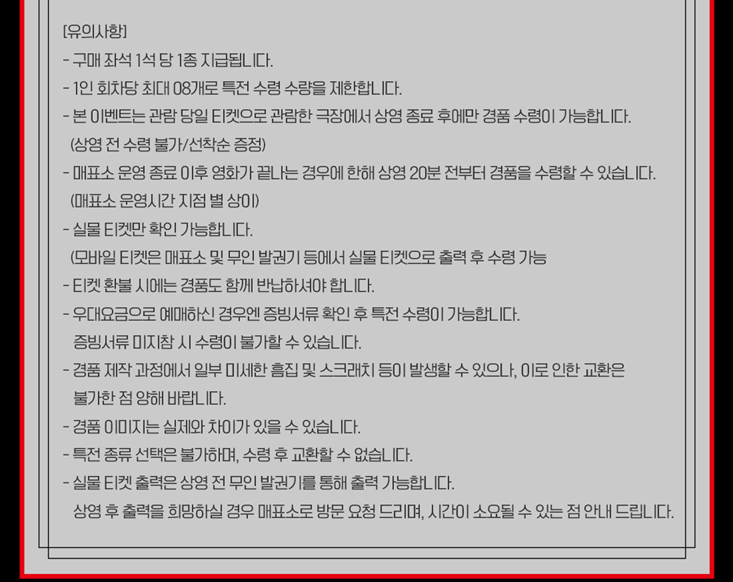 ※ 각 영화관(극장) 특전 경품 굿즈 목록 및 이벤트 목록은 이미지를 클릭하시면 잘린 곳 없이 전체가 잘 보입니다. 더욱 자세하게 내용 파악 및 유의사항 파악을 위해 꼭 클릭하셔서 확인하시고, 특전 경품 굿즈 수령과 이벤트 참여에 불찰 없으시길 바라겠습니다.
