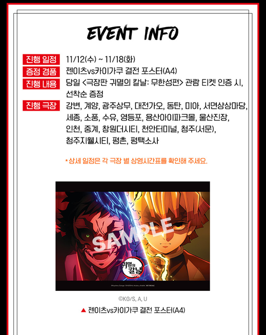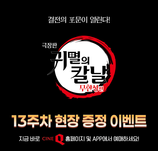 씨네 큐(CINE Q, 씨네 Q) 13주 차 주중 특전은 '젠이츠vs카이가쿠 결전 포스터(A4 사이즈)'입니다. 2025년 11월 12일 수요일부터 2025년 11월 18일 화요일까지 증정하며 소진되면 종료합니다.