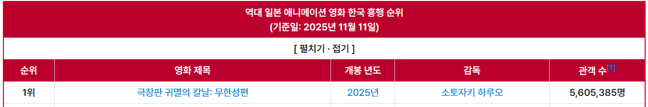며칠 전 애니메이션 극장판 <귀멸의 칼날: 무한성편>이 79일 만에 560만 명의 누적 관객수를 동원하면서 역대 일본 애니메이션 영화 한국 흥행 순위 1위에 등극했다고 소식 전해드렸습니다.