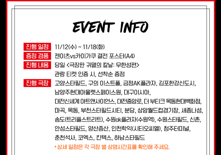 메가박스 13주 차 주중 특전도 역시 '젠이츠vs카이가쿠 결전 포스터(A4 사이즈)입니다. 2025년 11월 12일 수요일부터 2025년 11월 18일 화요일까지 증정하며 소진되면 종료합니다.