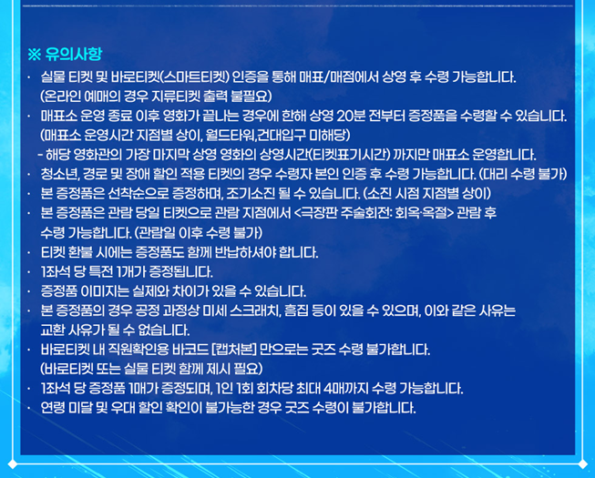 ※ 각 영화관(극장) 특전 경품 굿즈 목록 및 이벤트 목록은 해당 이미지를 클릭하시면 잘린 곳 없이 전체적으로 잘 보입니다. 더욱 자세하게 내용 파악 및 유의사항 파악을 위해 꼭 클릭하셔서 확인하시고, 특전 경품 굿즈 수령과 이벤트 참여에 불찰 없으시길 바라겠습니다.
