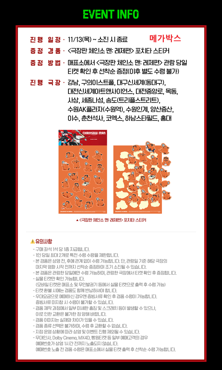 인기 캐릭터 포치타 스티커라니 저는 이것 탐납니다. 제일 좋은 방법의 특전 경품 굿즈 수령 방식은 다음과 같습니다. 물론 진행하는 상영관 지점이라는 전제와 특전 경품 굿즈가 해당 상영관 지점에서 소진되지 않았다는 전제니까 참고해 주시길 바랍니다.