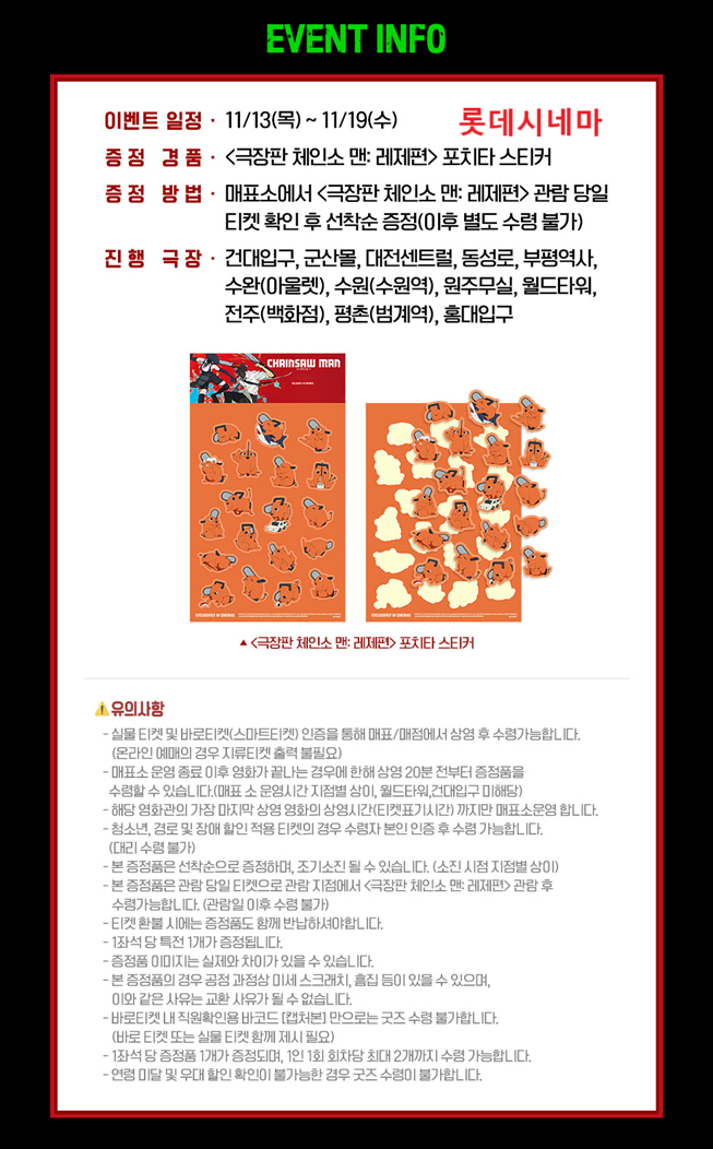 ※ 각 영화관(극장) 특전 경품 굿즈 목록 및 이벤트 목록은 해당 이미지를 클릭하시면 잘린 곳 없이 전체적으로 잘 보입니다. 더욱 자세하게 내용 파악 및 유의사항 파악을 위해 꼭 클릭하셔서 확인하시고, 특전 경품 굿즈 수령과 이벤트 참여에 불찰 없으시길 바라겠습니다.