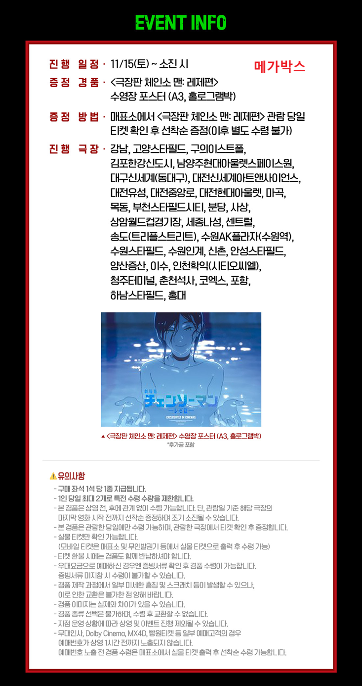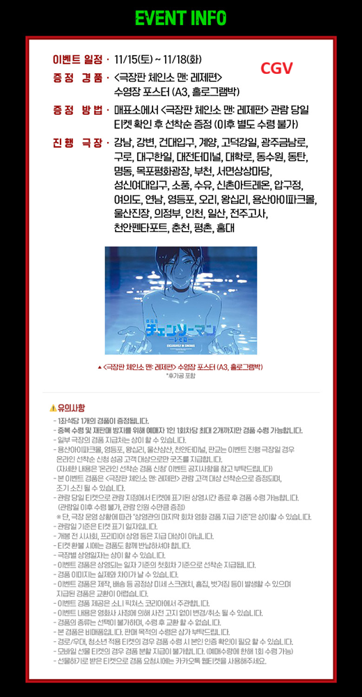 CGV는 11월 15일 토요일부터 2025년 11월 18일 화요일까지 증정하며 소진되면 종료합니다. CGV는 특별한 사항이 있습니다. CGV 상영관 중 영등포, 왕십리, 용산아이파크몰 지점은 특전 경품 굿즈 수령 방식이 기존 방식인 관람 후 지급이 아닌, 온라인 선착순 경품 신청 성공 고객에게만 특전 경품 굿즈를 지급한다고 하니 미리 신청하셔서 불찰 없으시길 바랍니다.