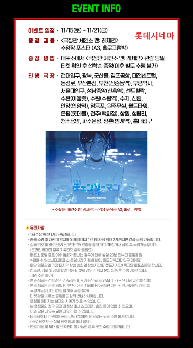 애니메이션 극장판 <체인소 맨: 레제편>이 엄청난 인기를 끄는 와중에, 수능이 끝난 수험생분들을 맞이할 준비가 되었습니다. 불과 어제 수능 당일엔 수능 특전 이벤트로 포치타 스티커를 증정했고, 이제 돌아오는 주말인 내일은 수포라고 불리는 '레제 수영장 포스터'를 증정합니다.