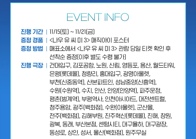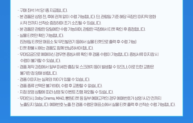 ※ 각 영화관(극장) 특전 경품 굿즈 목록 및 이벤트 목록은 이미지를 클릭하시면 잘린 곳 없이 전체적으로 확인이 가능합니다. 더욱 자세하게 내용 파악 및 유의사항 파악을 위해 꼭 클릭하셔서 확인하시길 바라며, 특전 경품 굿즈 수령과 이벤트 참여에 불찰 없으시길 바라겠습니다.