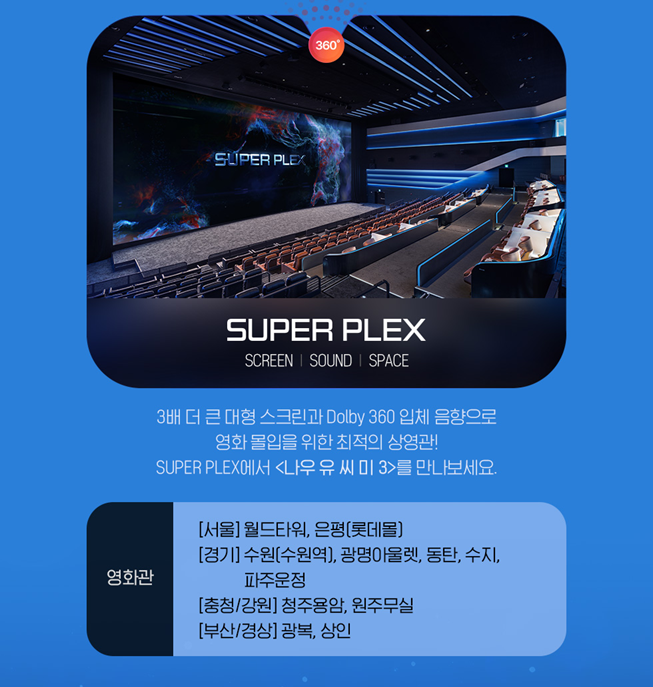 슈퍼플렉스(SUPER PLEX)는 3배 더 큰 대형 스크린과 DOLBY 360 입체 음향이 특징으로 영화 몰입을 최적화로 돕는 상여관이고,