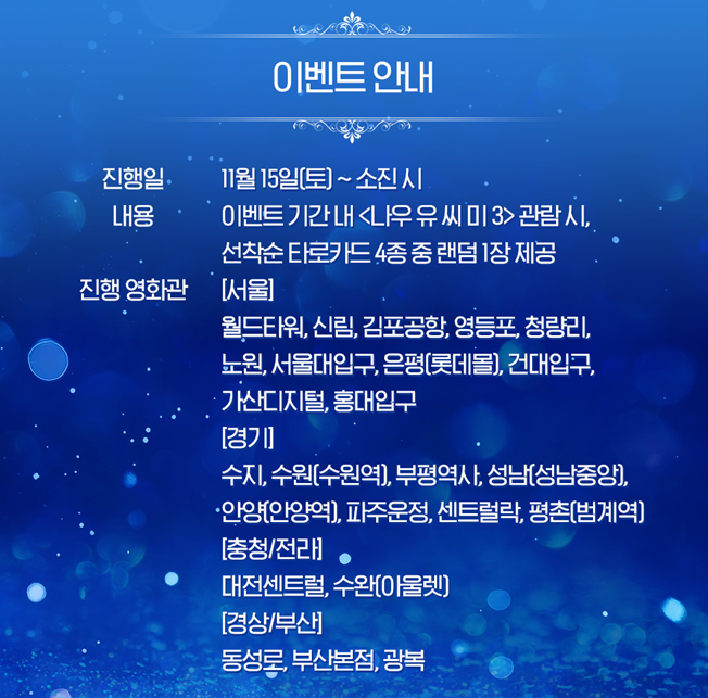 롯데시네마 1주 차 주말 이벤트로 '행운의 타로카드'를 증정합니다. 4종 중 랜덤 1종 증정으로, 2025년 11월 15일 토요일부터 소진될 때까지 증정합니다.