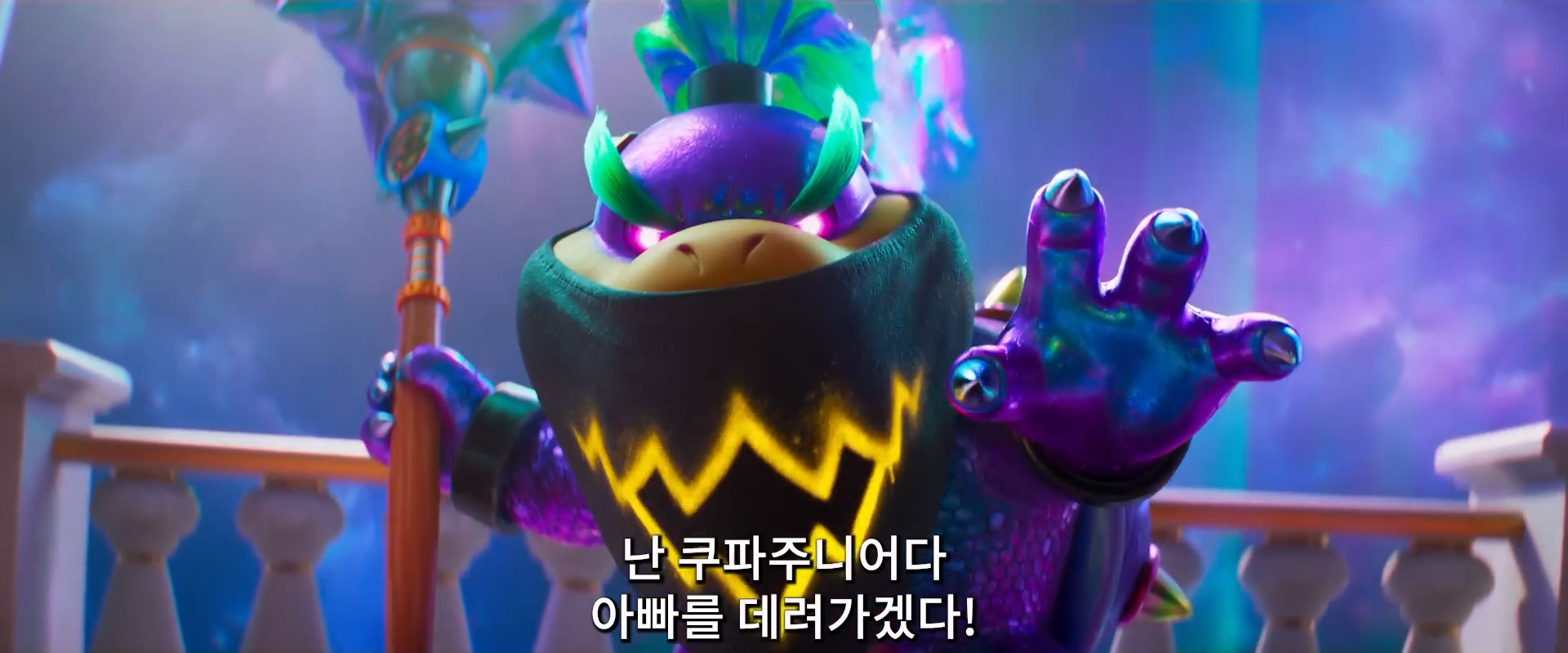 여기서 재밌는 것은 쿠파 주니어 디자인은 다른 버전에서 착안되었다고 합니다. 2023년에 나온 게임 <슈퍼 마리오 브라더스 원더>에서 쿠파 주니어가 원더 에너지를 흡수했을 때 변하는 모습의 디자인을, 이번 애니메이션 영화 <슈퍼 마리오 갤럭시>의 쿠파 주니어에 적용했다고 합니다. 이 형태는 몸이 어두운 푸른색에 턱받이 입은 날카로운 덫처럼 빛나며 움직이는 방식입니다.