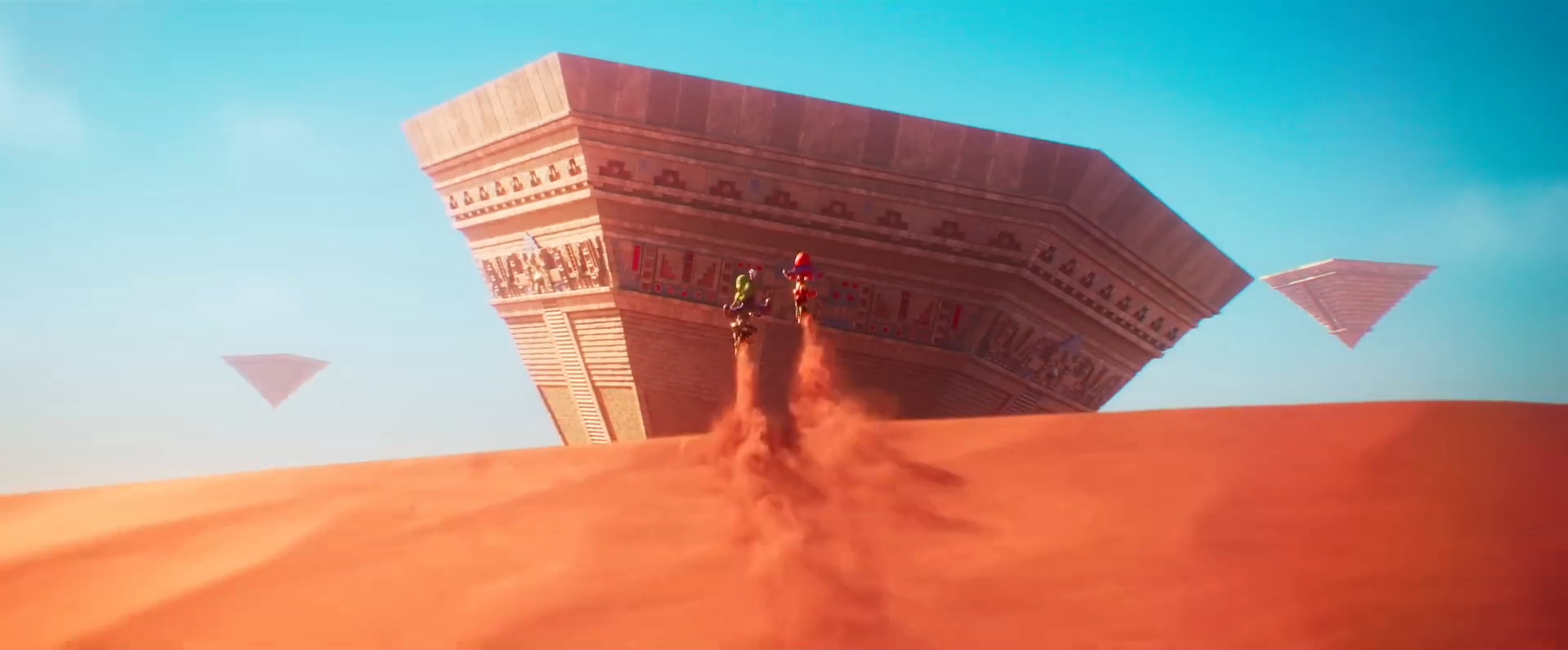 마지막으로, 오피셜 트레일러에서 게임 <슈퍼 마리오 오디세이>의 사막 왕국도 등장하며, 상공에 떠 있는 거대한 뒤집힌 피라미드 실루엣이 그대로 나옵니다. 이것은 특정 게임 하나를 정통으로 그대로 각색하기보다는 '슈퍼 마리오 프랜차이즈'에서 상징적인 요소들을 조합해 새로운 세계를 만든다는 전략을 1편에 이어 2편에서도 유지하는 것으로 보입니다.