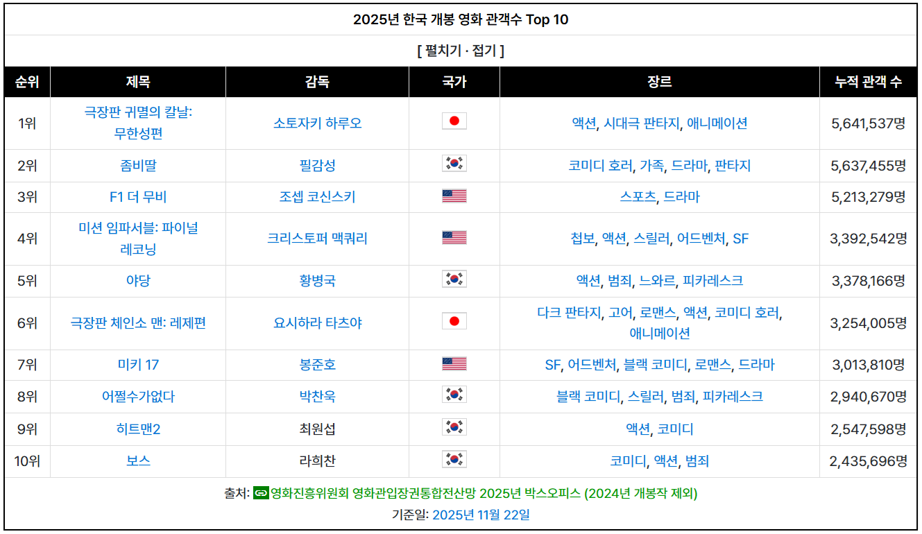 저는 영화 <아바타 3: 불과 재>가 앞선 1편과 2편 모두 천만 관객을 기록했기 때문에 이번에도 역시 천만을 돌파할 것으로 보는데, 워낙 경기가 침체도 되고, 영화관(극장)을 가는 인구가 워낙 많이 줄었으며, 2025년의 남은 날이 워낙 적기 때문에, 이러한 변수들로 아슬아슬하게 애니메이션 영화 <귀멸의 칼날>이 2025년 한국 박스오피스 1위를 지키지 않을까 생각하고 있습니다.