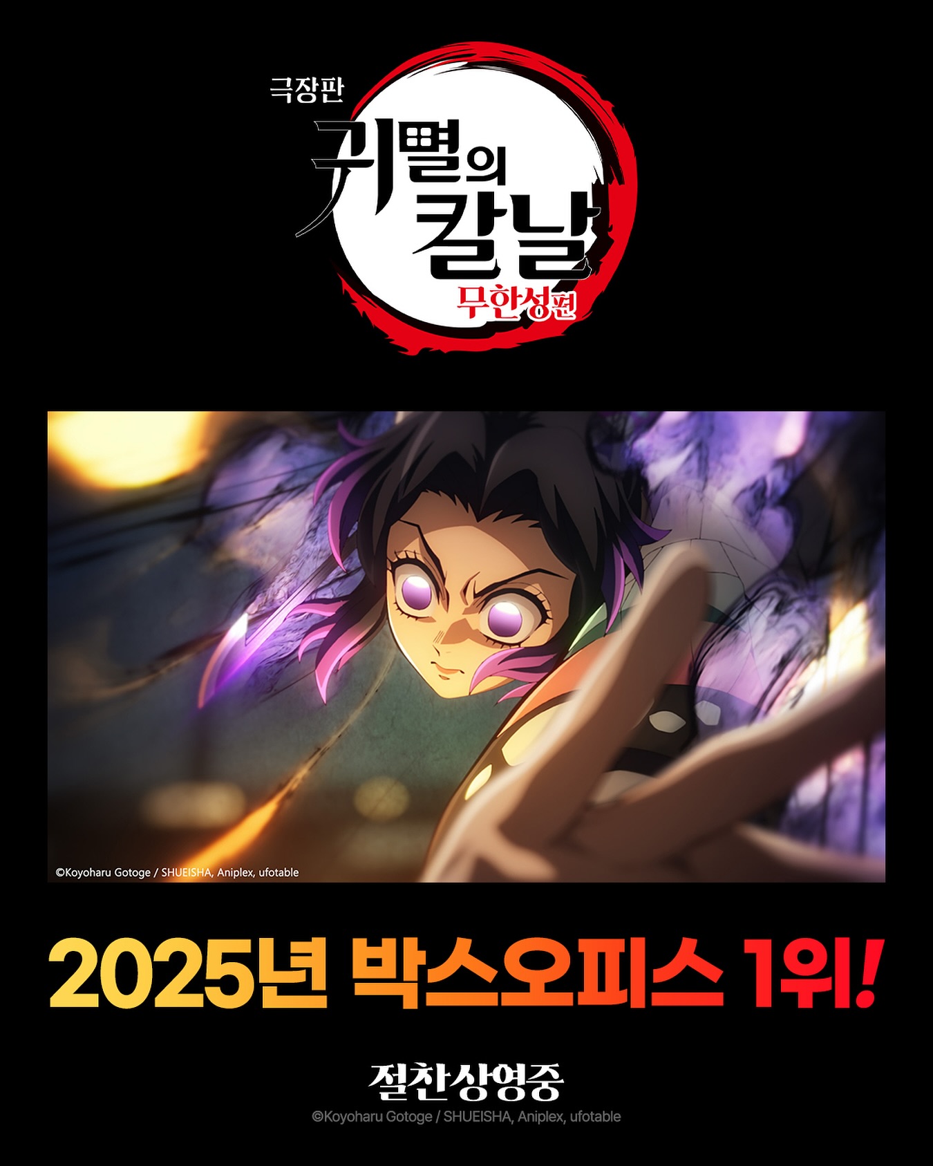 애니메이션 극장판 <귀멸의 칼날: 무한성편> 93일 만에 2025년 한국 개봉 영화 흥행 순위 1위 달성!