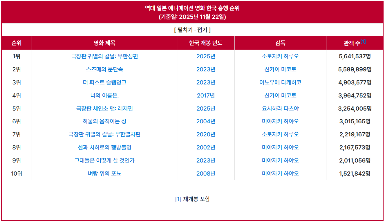 현재 애니메이션 극장판 <귀멸의 칼날: 무한성편>은 계속해서 대한민국 영화계의 각종 기록을 깨고 있는데, 만약 남은 2025년에 조만간 개봉할 애니메이션 영화 <주토피아 2>와 영화 <아바타 3: 불과 재>가 선풍적인 인기를 끌지 않는다면 2025년에 최고로 흥행한 영화과 되는 것 동시에, 역대 최초로 일본 애니메이션 영화가 연간 한국 박스오피스 1위를 달성하는 것입니다.