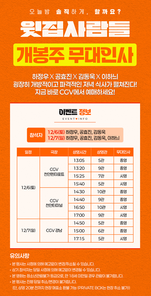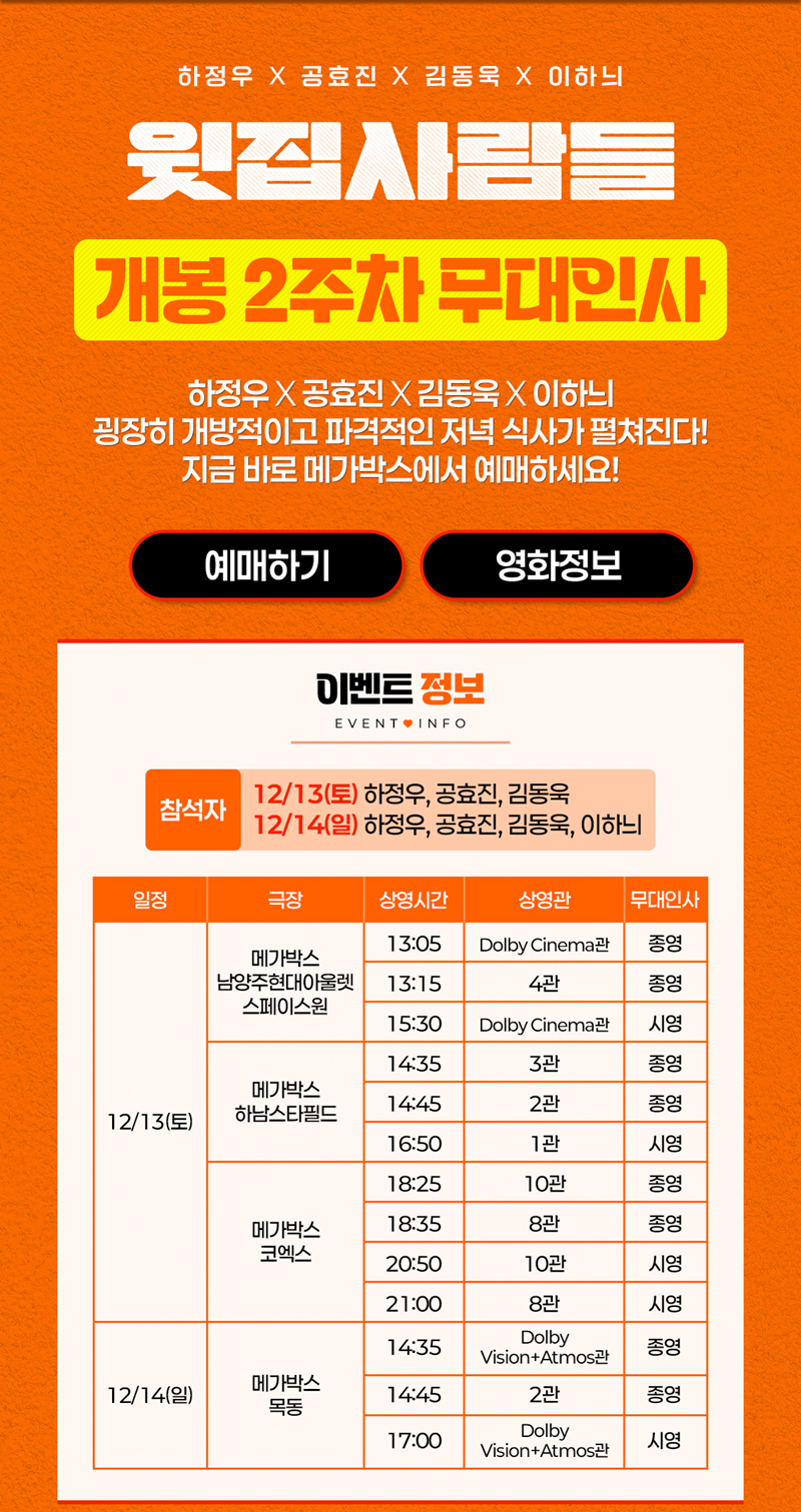 마지막으로 CGV, 롯데시네마, 메가박스 1주 차 및 2주 차 무대인사 정보를 정리하며 마칩니다. 클릭하셔서 확인하시길 바랍니다. CGV 1, 2주 차 - 롯데시네마 1, 2주 차 - 메가박스 1, 2주 차 순입니다.