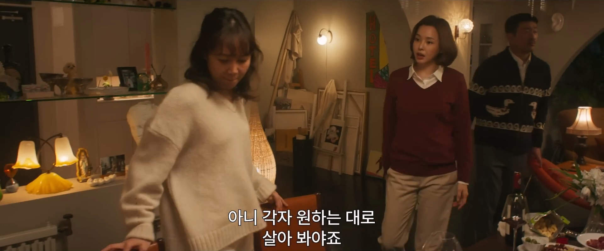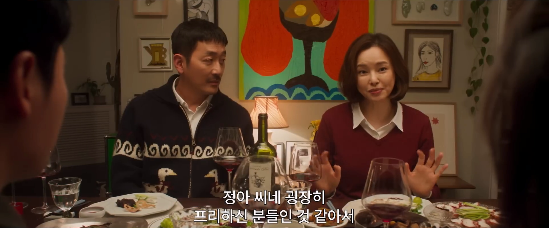 정아는 아랫집 부부의 아내로, 남편과 함께 윗집에서 나는 밤마다 소음 때문에 스트레스를 받으며, 결국 윗집 부부를 저녁 식사에 초대하게 되고, 영화 초반엔 무미건조하고 권태로운 결혼생활을 보내는 인물로 설정되어 윗집 부부와의 사건을 계기로 점차 변화를 맞게 되는 인물입니다.