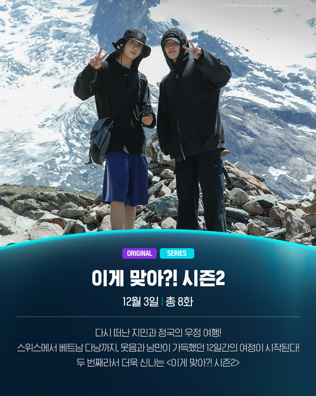 디즈니+ 오리지널 한국 예능 <이게 맞아?! - 시즌2>가 공개됩니다. BTS(방탄소년단) 지민과 정국의 리얼리티 여행을 담았습니다. 저는 나중에 몰아서 볼 것 같습니다.