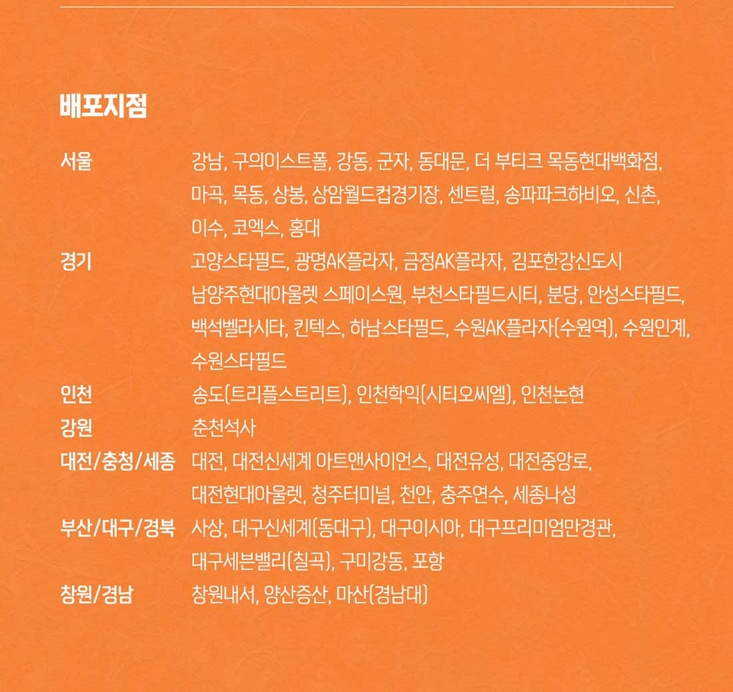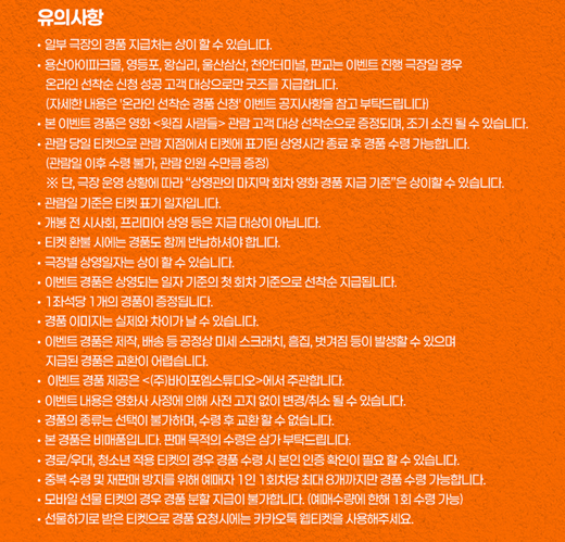CGV 상영관 중 영등포, 왕십리, 용산아이파크몰, 울산삼산, 판교 지점은 기존 방식이 아닌 새로운 방식인 '온라인 선착순 신청 완료 고객'에게만 특전 경품 굿즈를 지급합니다. 미리 신청하셔서 특전 경품 굿즈를 수령하시길 바랍니다. 그 외의 다른 상영관 지점은 기존 방식인 관람 후에 특전 경품 굿즈를 수령하시면 됩니다.