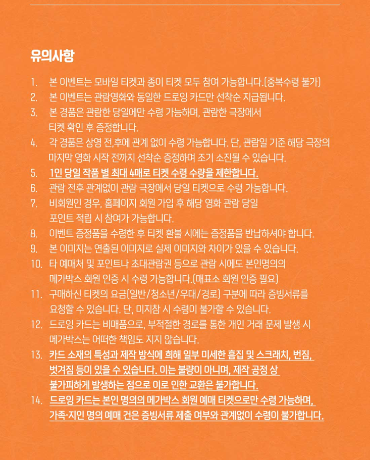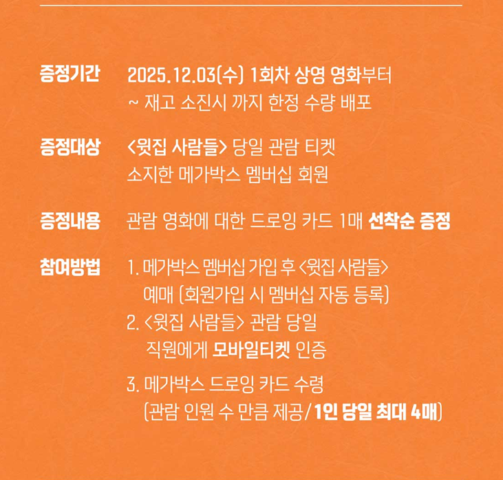메가박스 1주 차 특전은 '드로잉 카드'입니다. 2025년 12월 3일 수요일부터 소진될 때까지 증정합니다.