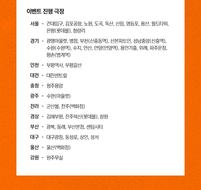 ※ 각 영화관(극장)의 특전 경품 굿즈 목록 및 이벤트 목록은 이미지를 클릭하시면 잘린 곳이나 잘 안 보이는 곳 없이 전체적으로 확인이 가능합니다. 더욱 자세하게 내용 파악 및 유의사항 파악을 위해 꼭 클릭하시고 정보를 확인하셔서 특전 경품 굿즈 수령과 이벤트 참여에 차질 없으시길 바라겠습니다.