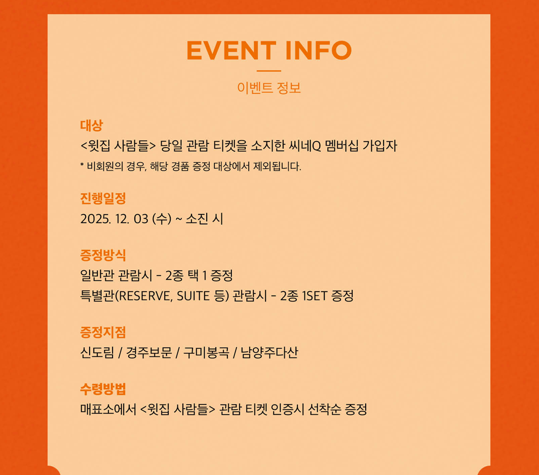 씨네큐(씨네Q, CINEQ) 1주 차 특전은 '스페셜 티켓'입니다. 2025년 12월 3일 수요일부터 소진될 때까지 증정합니다.