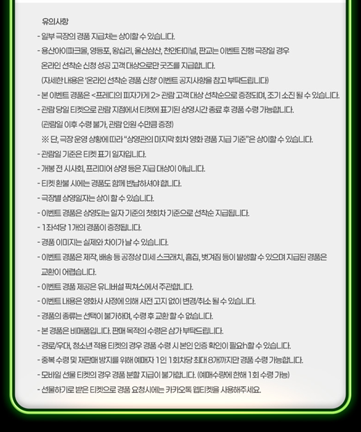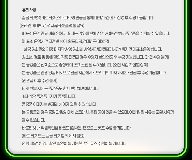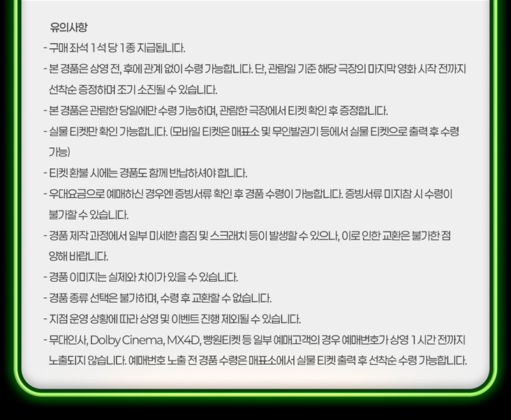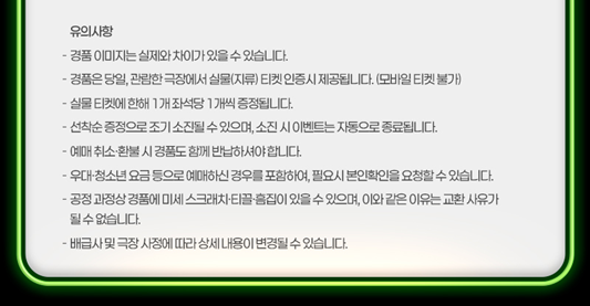 CGV 상영관 중 영등포, 왕십리, 용산아이파크몰, 울산삼산, 천안터미널, 판교 지점은 특전 경품 굿즈 수령 방식이 다릅니다. 기존 방식이 아닌 '온라인 선착순 신청 완료 고객'에게만 특전 경품 굿즈를 지급합니다. 미리 신청하셔서 특전 경품 굿즈를 수령하실 수 있길 바라겠습니다. 그 외의 다른 상영관 지점은 기존 방식인 관람 후에 특전 경품 굿즈를 수령하시면 됩니다.