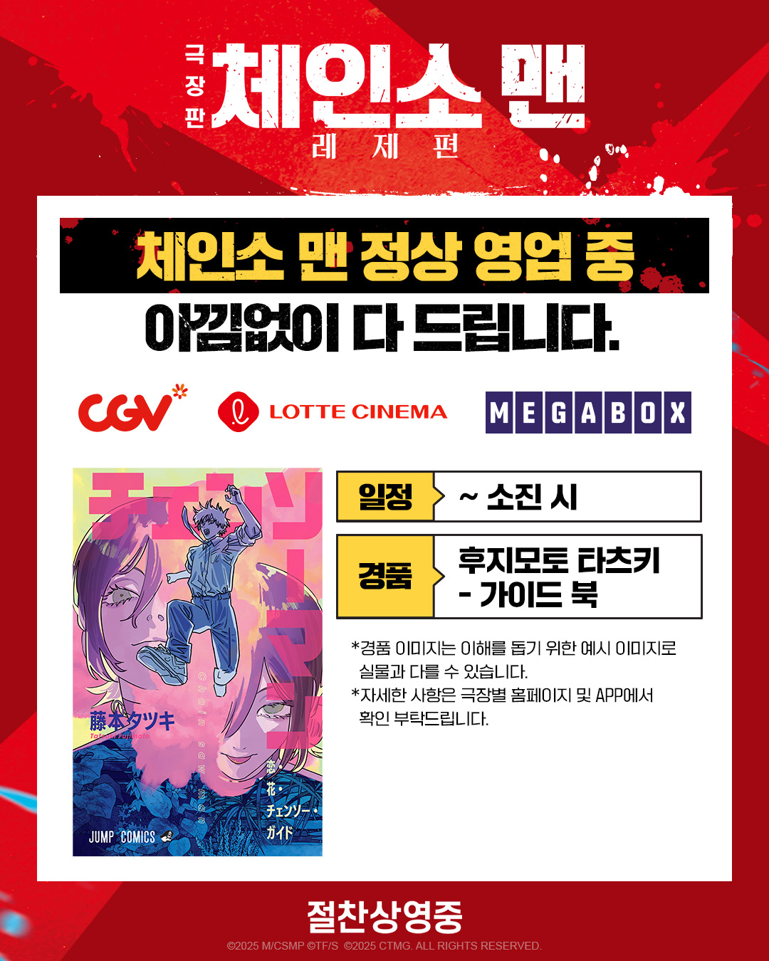 CGV, 롯데시네마, 메가박스 12주 차 주말 특전은 '후지모토 타츠키 가이드 북'입니다.