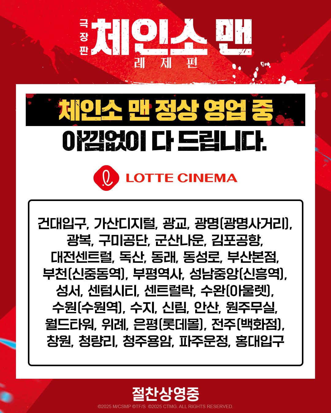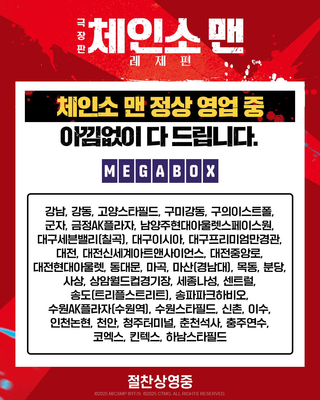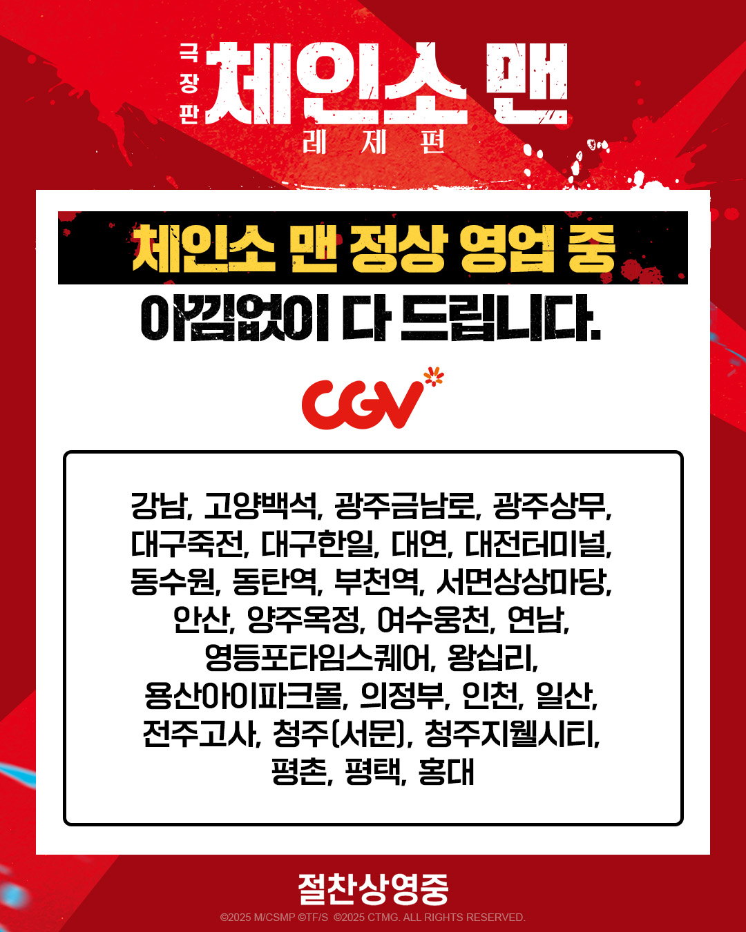 CGV, 롯데시네마, 메가박스 12주 차 주말 앵콜 현장 증정 이벤트 지급 상영관 지점 목록