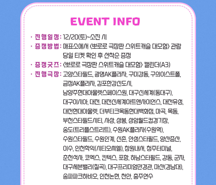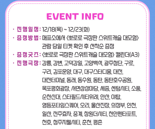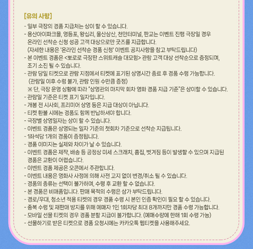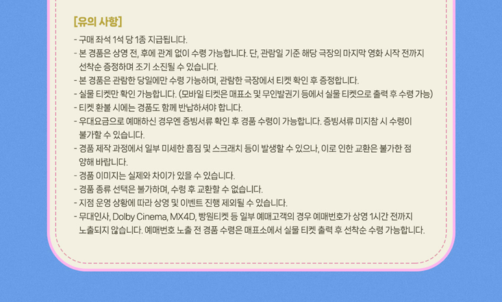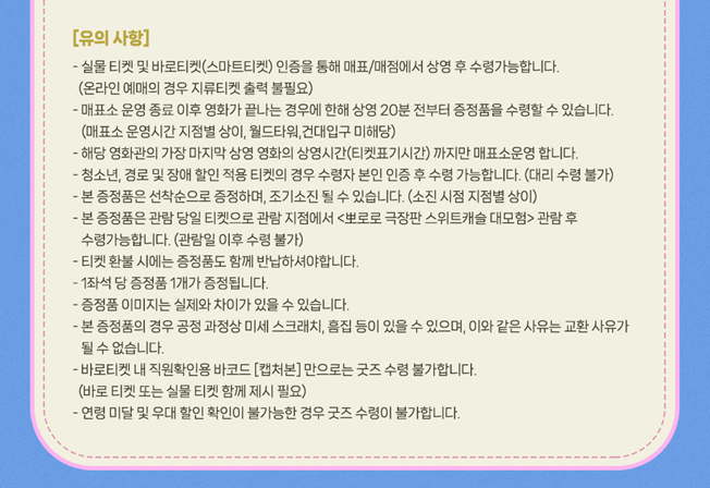 ※ 영화관(극장)의 특전 및 이벤트 목록은 이미지를 클릭하시면 보이지 않는 곳 없이 전체적으로 자세하게 확인이 가능합니다. 더욱 명확하게 내용 파악 및 유의사항 파악을 위해 꼭 클릭하셔서 정보를 확인하시고 특전 수령과 이벤트 참여에 불찰 없으시길 바랍니다.