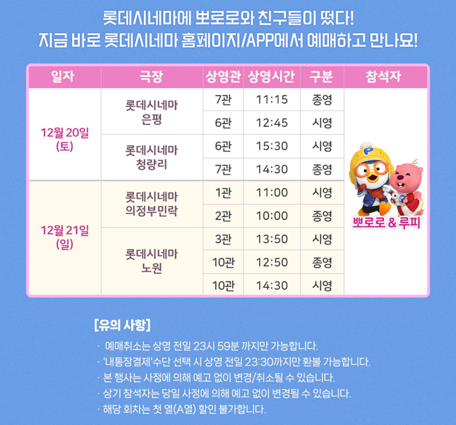 롯데시네마 은평, 청량리, 의정부민락, 노원에서 '뽀로로 & 루피'의 무대인사 이벤트가 진행됩니다. 진행 상영관 지점은 이미지를 클릭하셔서 확인하시길 바랍니다.
