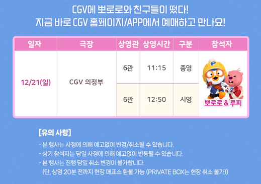 CGV 의정부에서 2025년 12월 21일 일요일 오전 11시 15분과 낮 12시 50분에 '뽀로로 & 루피'의 무대인사 이벤트가 진행됩니다.