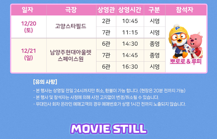 메가박스 고양스타필드, 남양주현대아웃렛스페이스원에서 '뽀로로 & 루피'의 무대인사 이벤트가 진행됩니다. 진행 상영관 지점은 이지미지를 클릭하셔서 확인하시길 바랍니다.