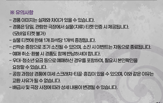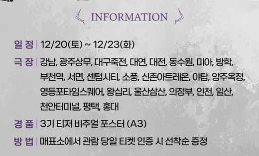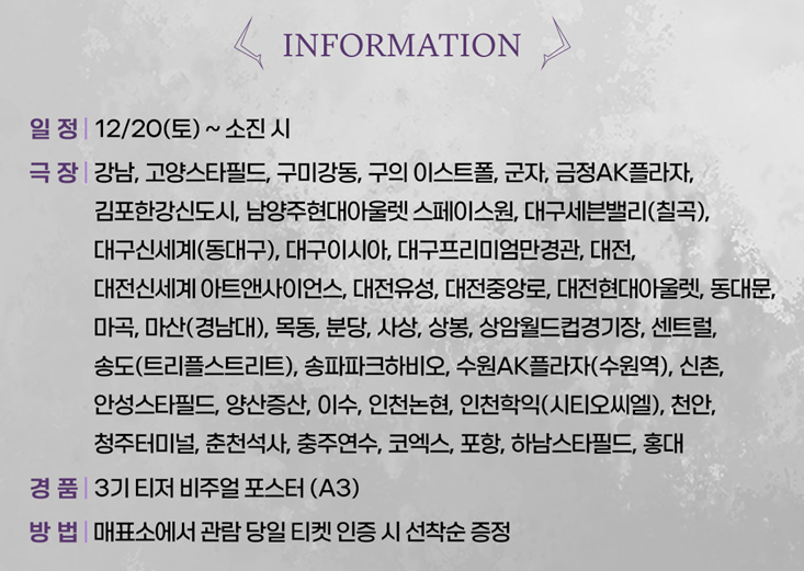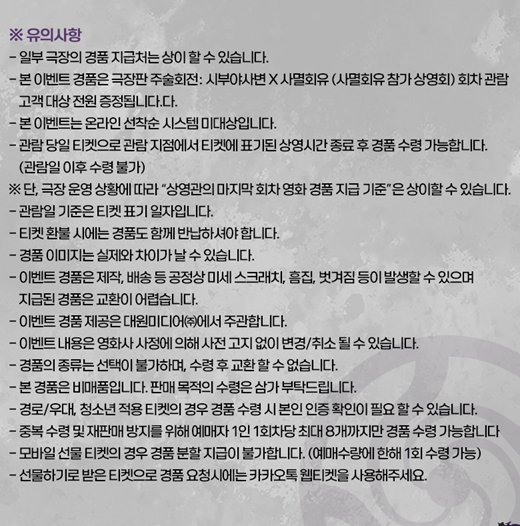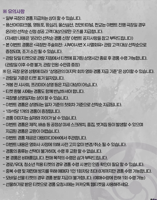 ※ 영화관(극장)의 특전 및 이벤트 목록은 이미지를 클릭하시면 보이지 않는 곳 없이 전체적으로 자세하게 확인이 가능합니다. 더욱 명확하게 내용 파악 및 유의사항 파악을 위해 꼭 클릭하셔서 정보를 확인하시고 특전 수령과 이벤트 참여에 불찰 없으시길 바랍니다.