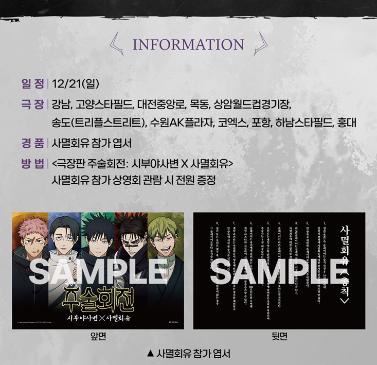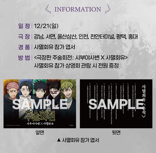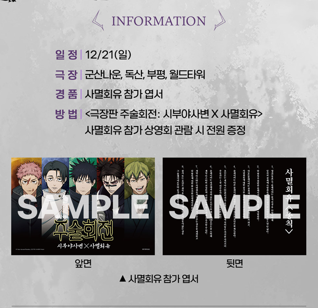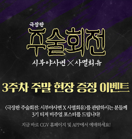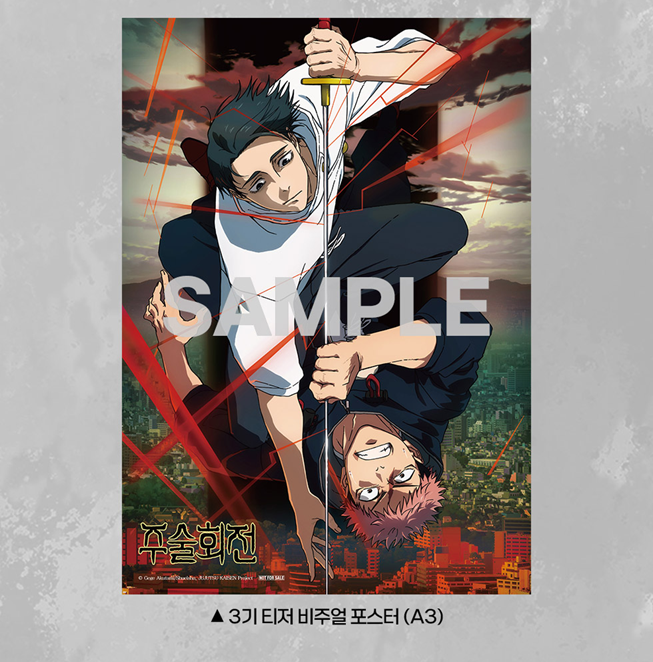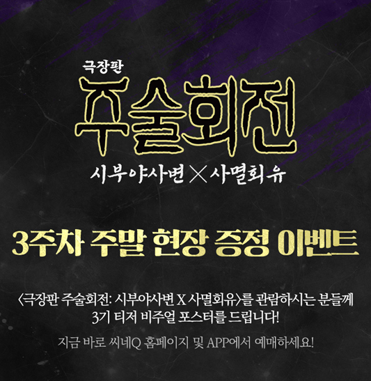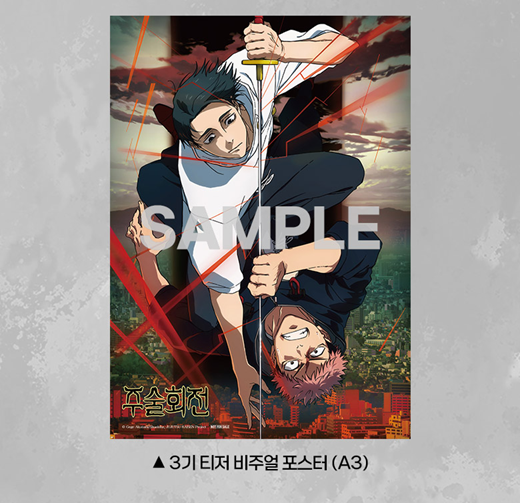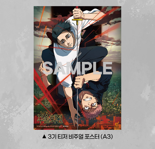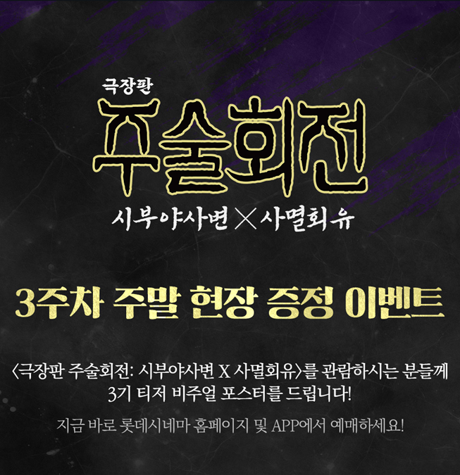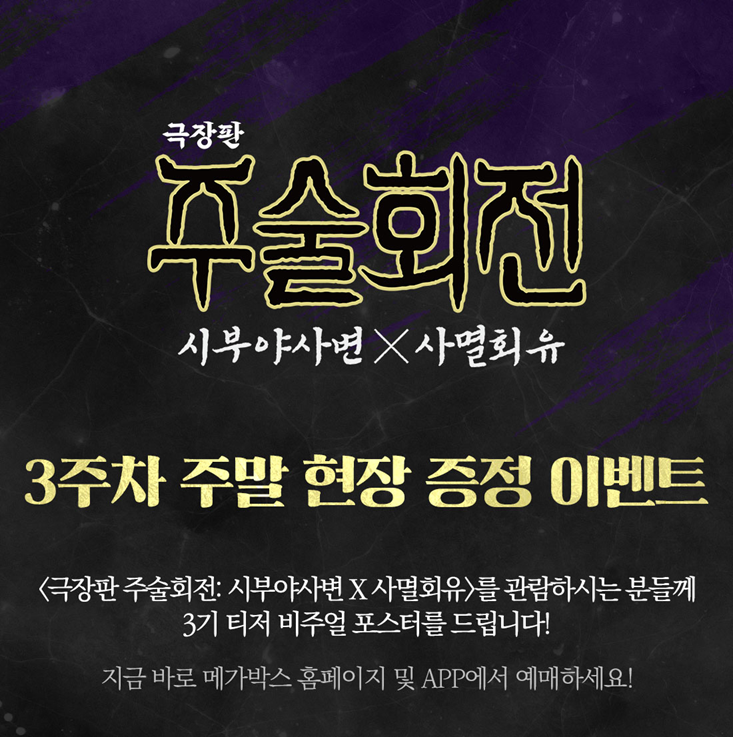 애니메이션 극장판 <주술회전: 시부야사변 X 사멸회유>가 3주 차가 마무리되고 있습니다. 그러면서 이번에도 주말 특전이 공개되었는데, 수령하셔서 영화 관람과 동시에 특별한 추억을 남기시길 바랍니다. 위의 이미지들은 3기 티저 비주얼 포스터 특전 실물입니다.